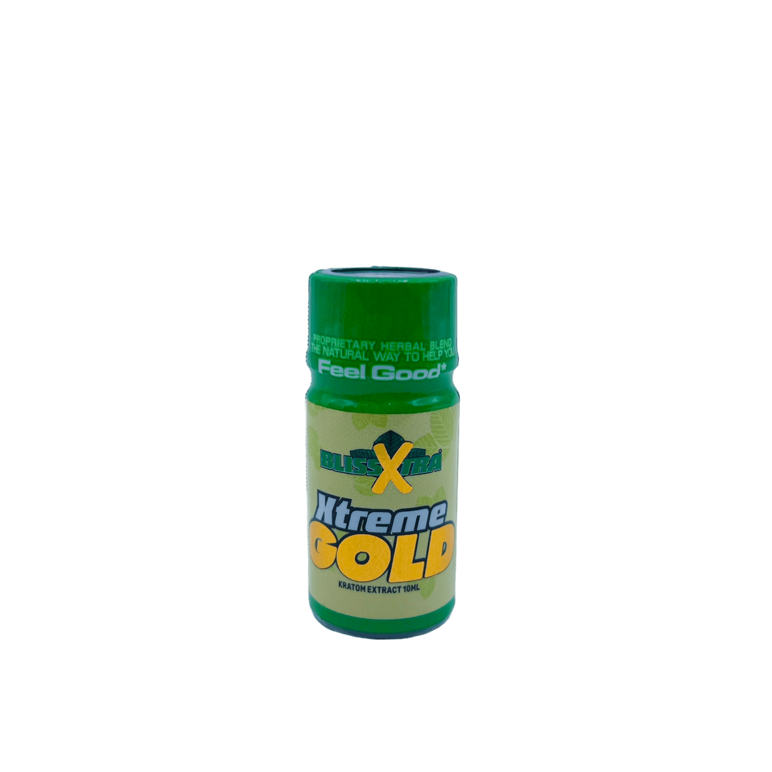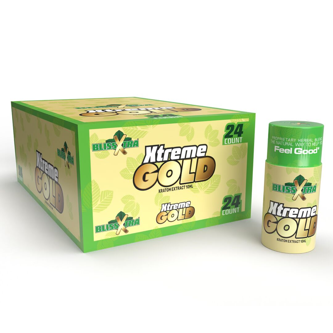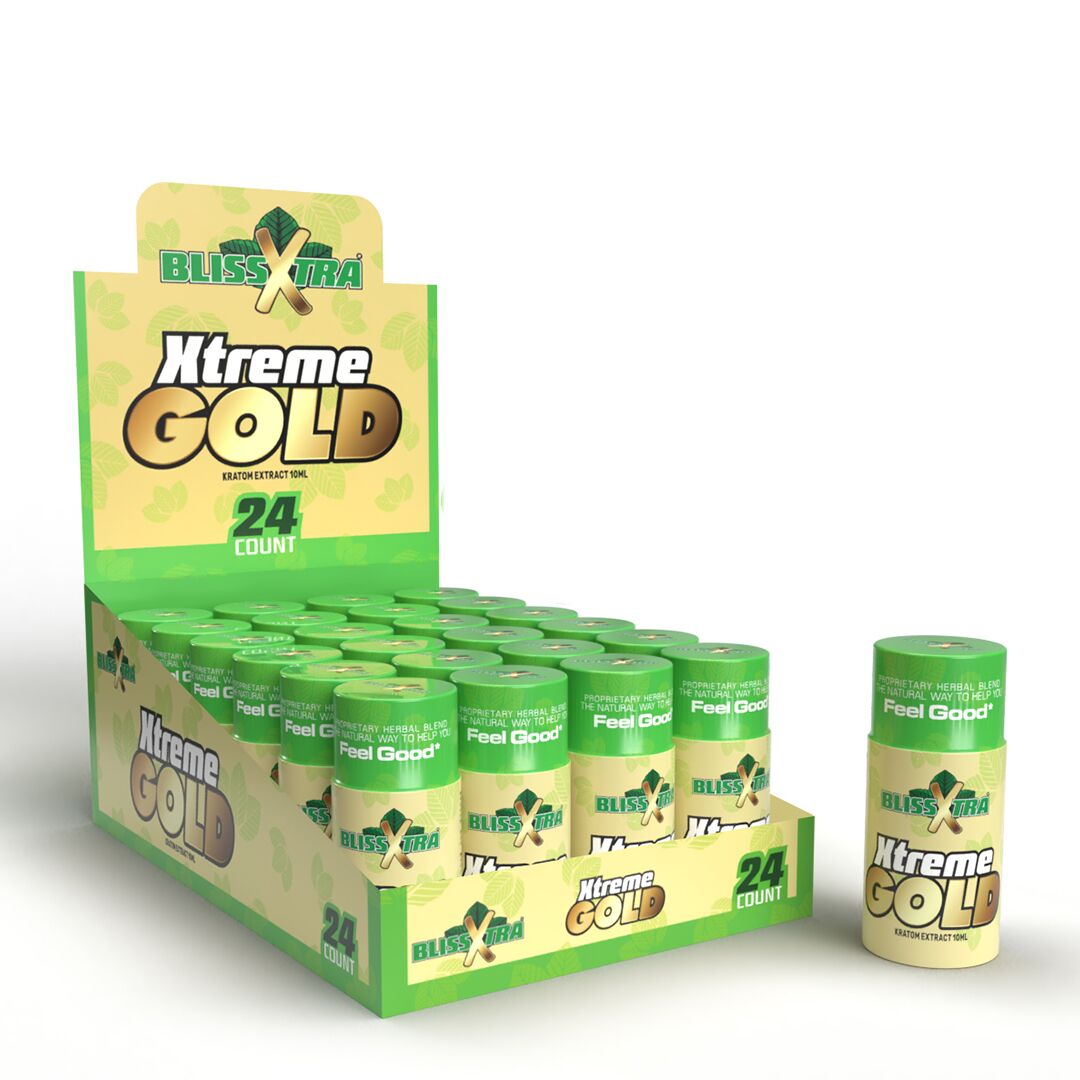 Bliss Xtra Kratom Xtreme Gold Shot 10ml, may contain trace amounts of food grade alcohol.