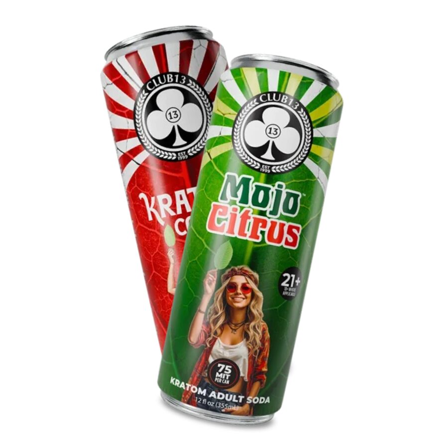 Club13 Kratom Soda 12oz is a ready-to-drink, sugar-free kratom beverage line featuring 75mg of full-spectrum Mitragynine and 40mg of caffeine per can, crafted for adults who want a crisp, flavorful lift in a convenient format. Available in Mojo Citrus and Kratom Cola, each can is designed to deliver a bright, carbonated pick-me-up when served cold or over ice.