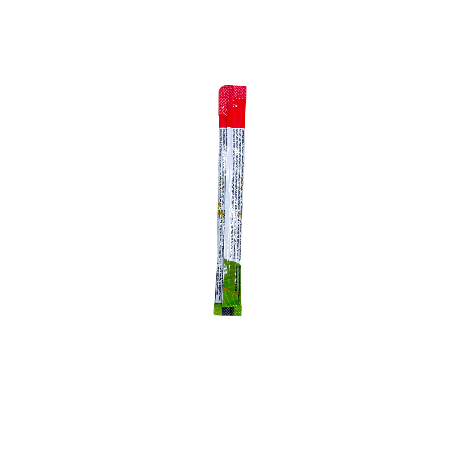 AMOUNT PER SERVING: CALORIES 3 (0% DV), FAT 0G (0% DV), SAT.FAT 0G(0%DV), CARBS. 0G(0%DV), SUGARS 0G(0%DV), SALT 0G(0%DV), PROTEIN 0G(0%DV), VIT.C 20MG (25% DV), MITRAGYNINE 50MG (*% DV). NET QUANTITY 3.5G / 0.123 OZ PER PACK. * % OF DAILY REFERENCE INTAKE (DRI)