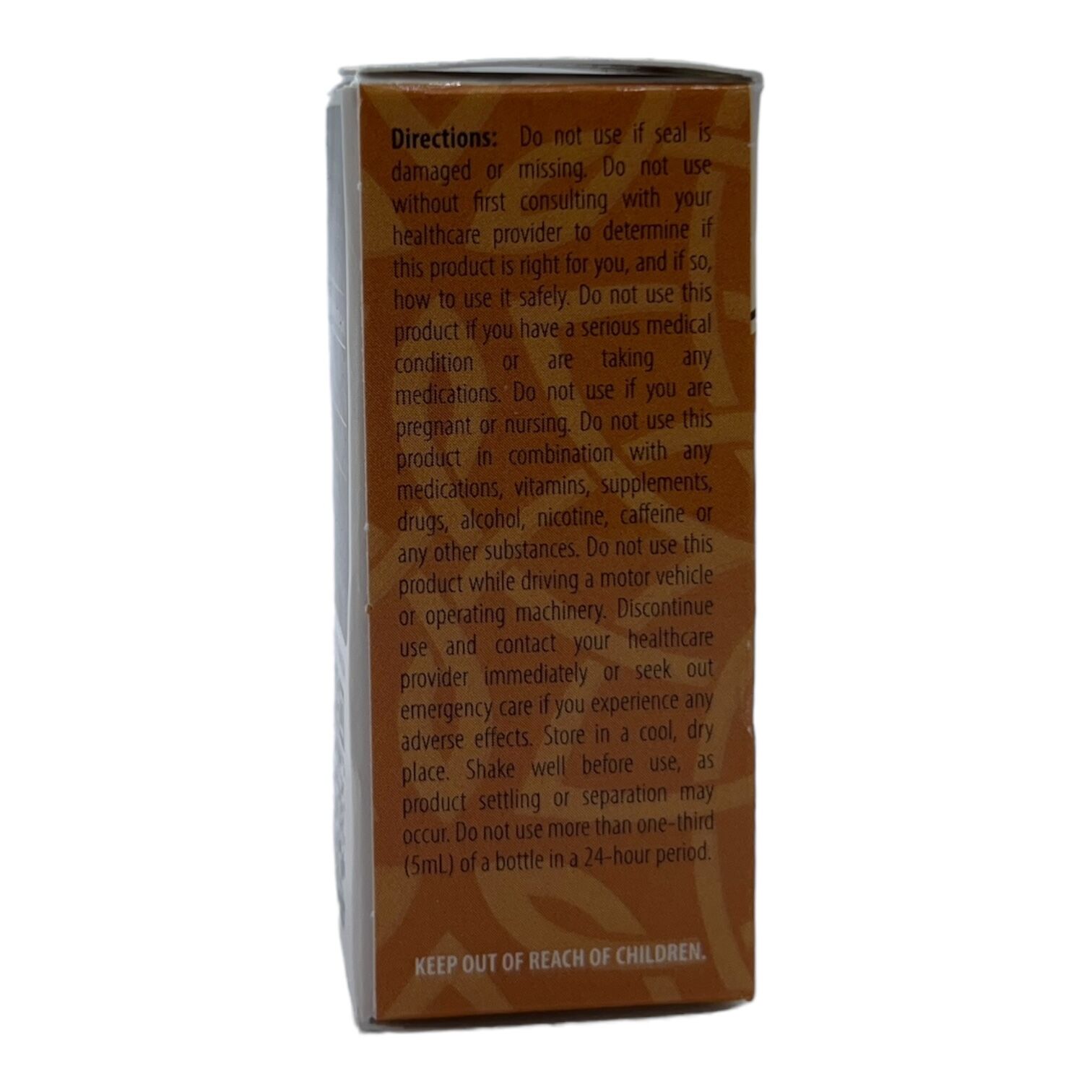 Discontinue use and contact your healthcare provider immediately or seek out emergency effects. Store in a cool, dry place. Shake well before use, as product settling, or separation may occur. Do not use more than one-third (5mL) of a bottle in a 24-hour period.