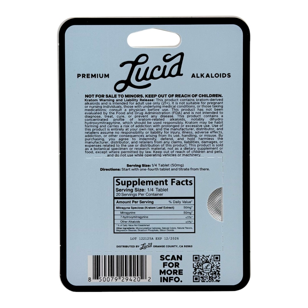 Lucid Black Label Kratom Tablets 200mg x 5ct are high-strength, tablet-based kratom alkaloid tablets intended strictly for experienced adult users (21+) who want concentrated servings in a compact, scored format. Each pack contains five 200mg tablets, with a suggested serving size of 1/4 tablet (50mg), providing 20 servings per container.