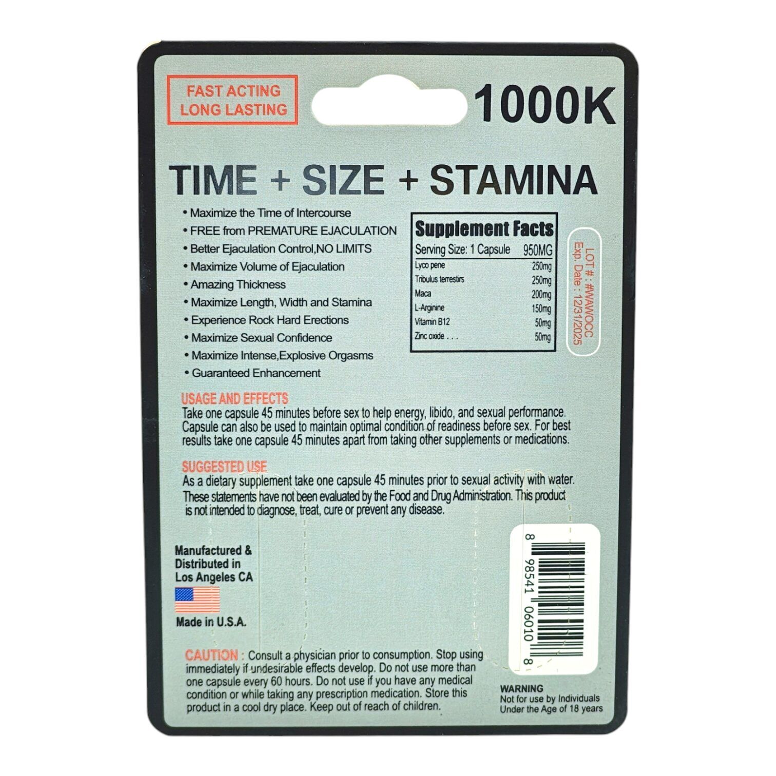 Lyco Pene 250mg, Tribulus Terrestirs 250mg, Maca 200mg, L-Arginine 150mg, Vitamin B12 50mg, Zinc Oxide 50mg