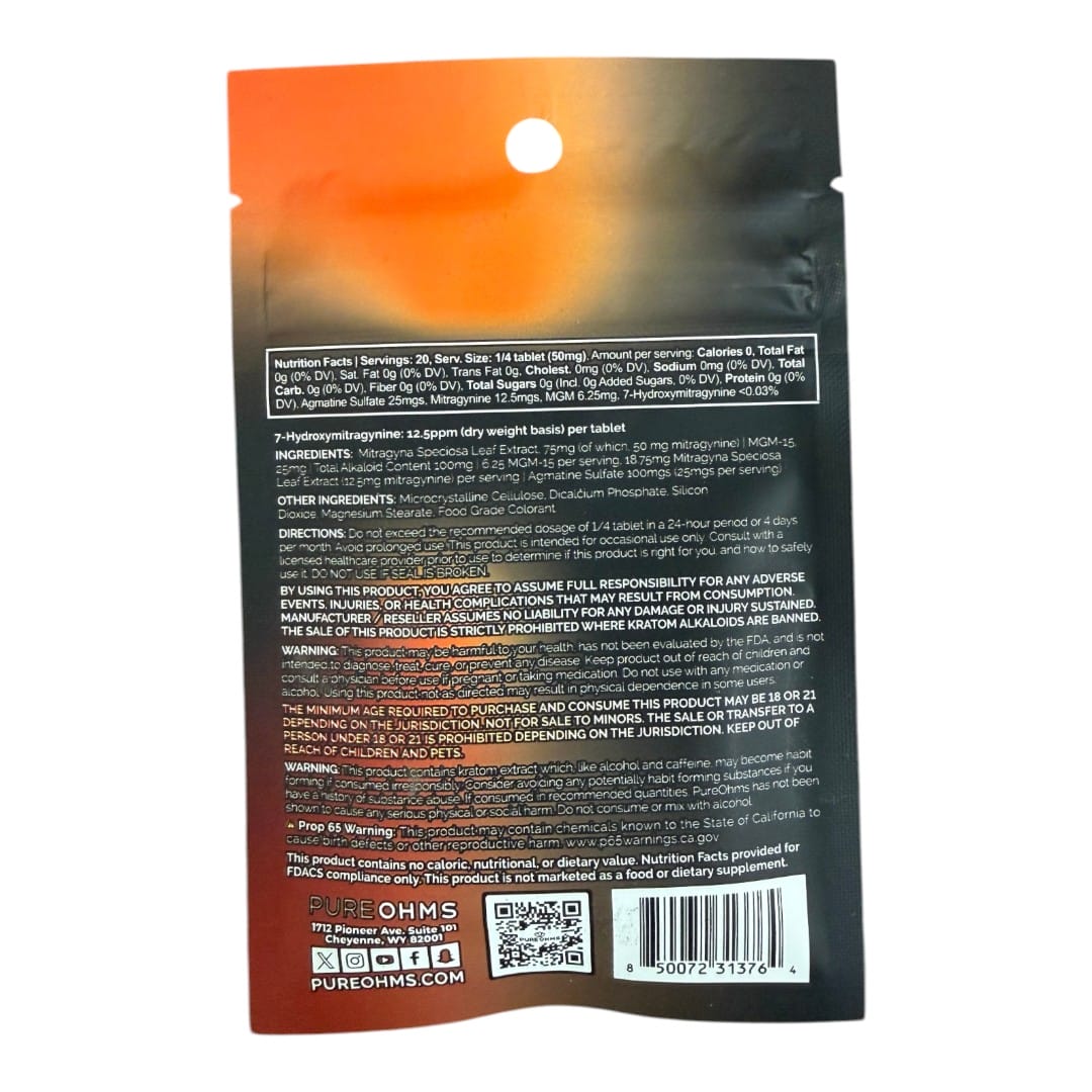 Nutrition Facts | Servings: 20, Serv. Size: 1/4 tablet (50mg). Amount per serving: Calories 0, Total Fat 0g (0% DV). Sat. Fat 0g (0% DV), Trans Fat 0g, Cholest. 0mg (0% DV), Sodium 0mg (0% DV), Total Carb. Oq (0% DV), Fiber 0g (0% DV), Total Sugars 0g (Incl. 0g Added Sugars, 0% DV), Protein 0g (0% DV), Agmatine Sulfate 25mgs, Mitragynine 12.5mgs, MGM 6.25mg, 7-Hydroxymitragynine <0.03%