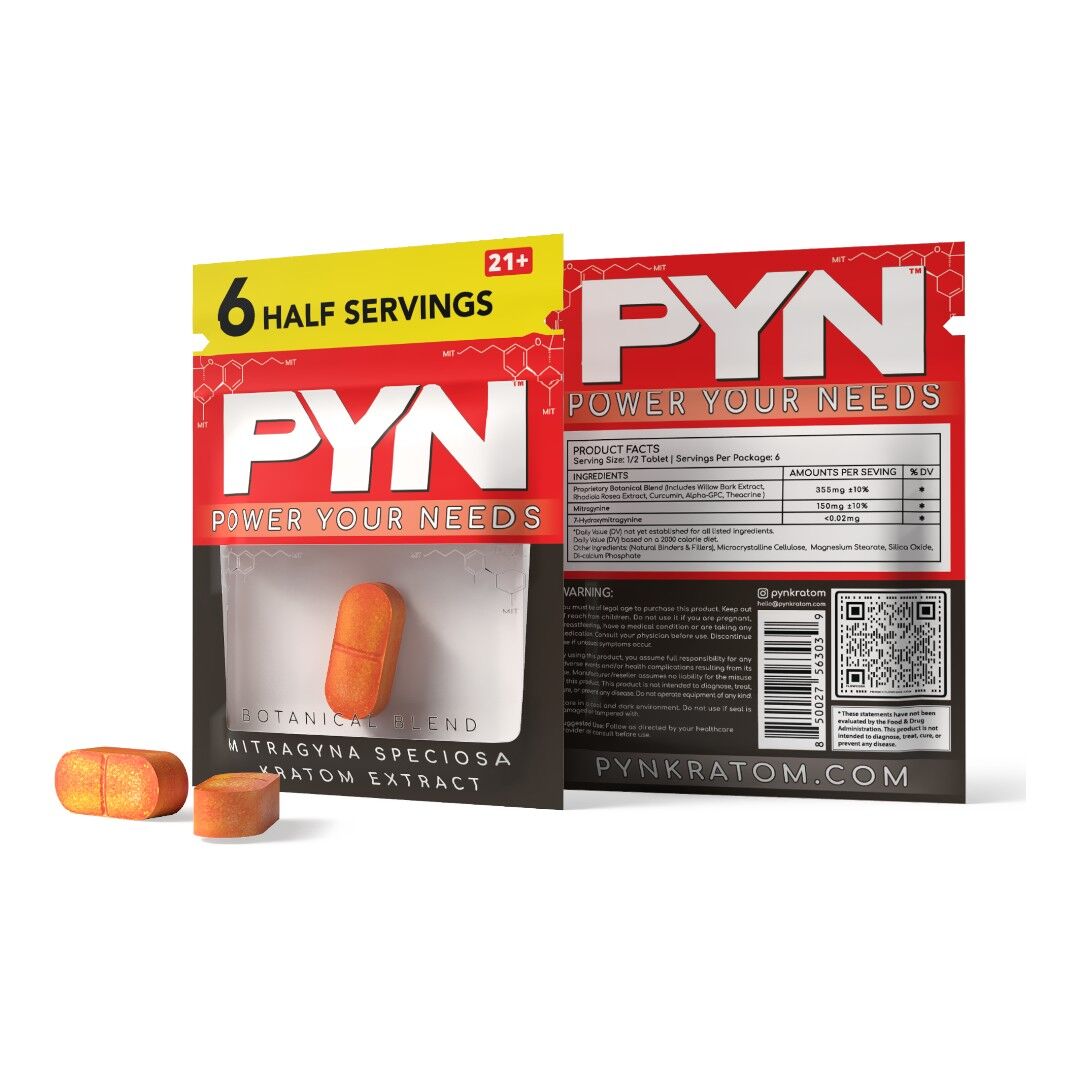 Experience the tablet that’s making waves—PYN Kratom Extract Tablets. Each powerful chewable delivers a clean, plant-based energy boost with 1000mg of total botanical actives, combining 300mg of premium kratom extract with 700mg of advanced nootropics like Rhodiola, Alpha-GPC, Theacrine, Curcumin, and Willow Bark.