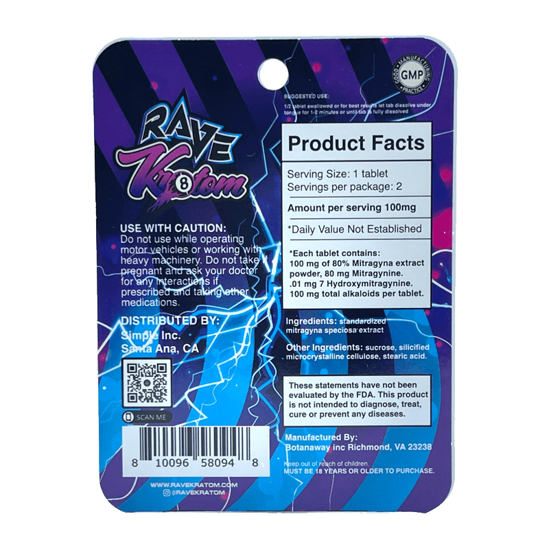 Ingredients: Each tablet contains 100mg of 80% Mitragyna extract powder, 80mg Mitragynine, 0.01mg 7 Hydroxymitragynine, 100mg total alkaloids per tablet.