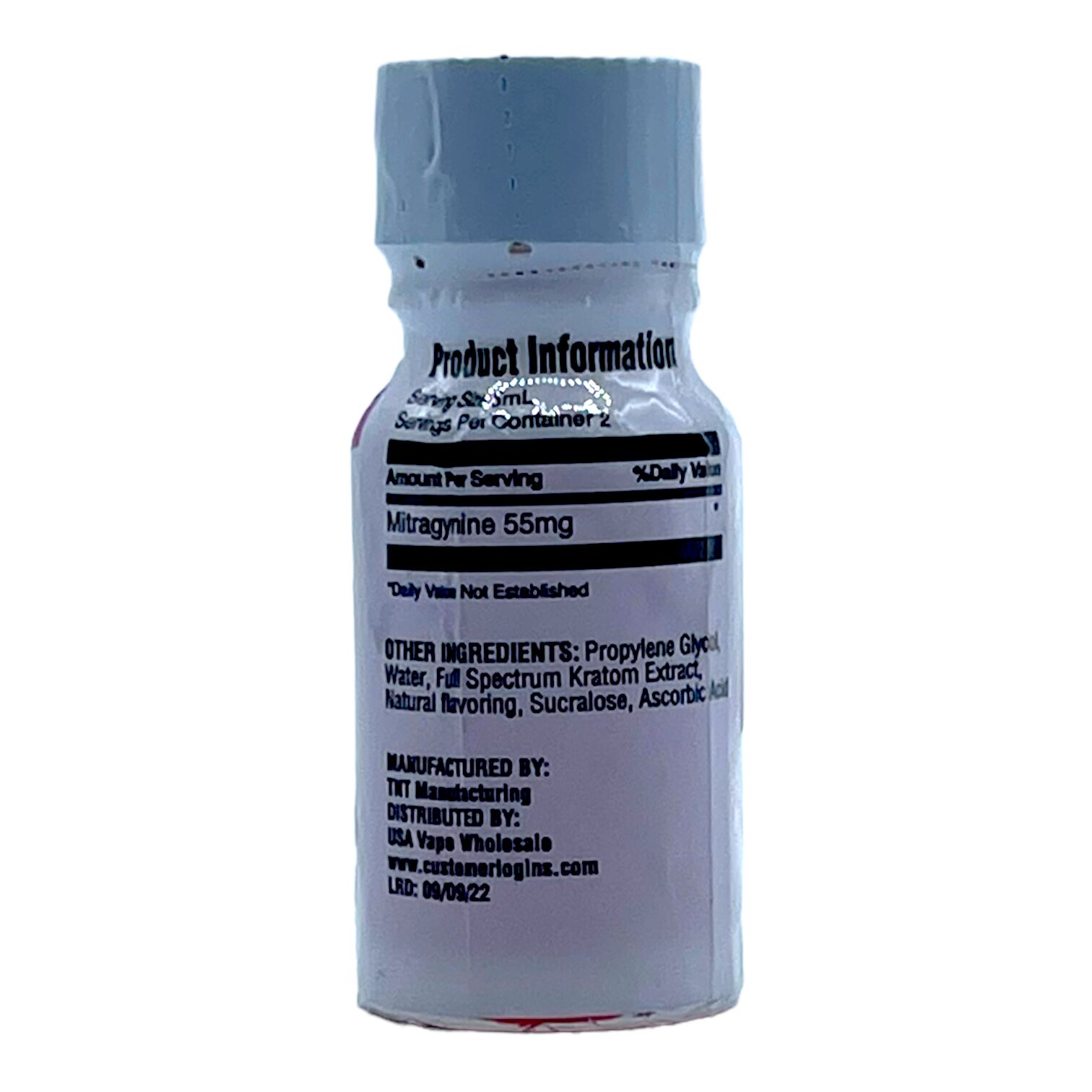 Ingredients: Propylene Glycol, Water, Full Spectrum Kratom Extract, Natural Flavoring, Sucralose, Ascorbic Acid.