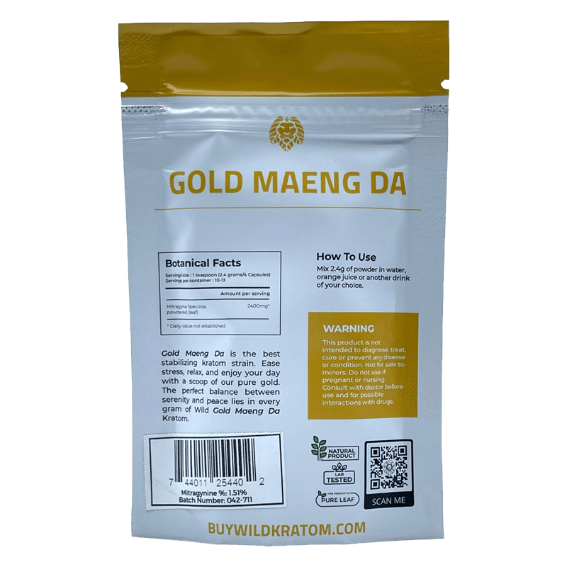 Gold Maeng Da is possibly the best stabilizing kratom strain. You may ease stress, relax, and enjoy your day with a scoop of our pure gold. The perfect balance between serenity and peace may lie in every gram of Wild Gold Maeng Da Kratom.